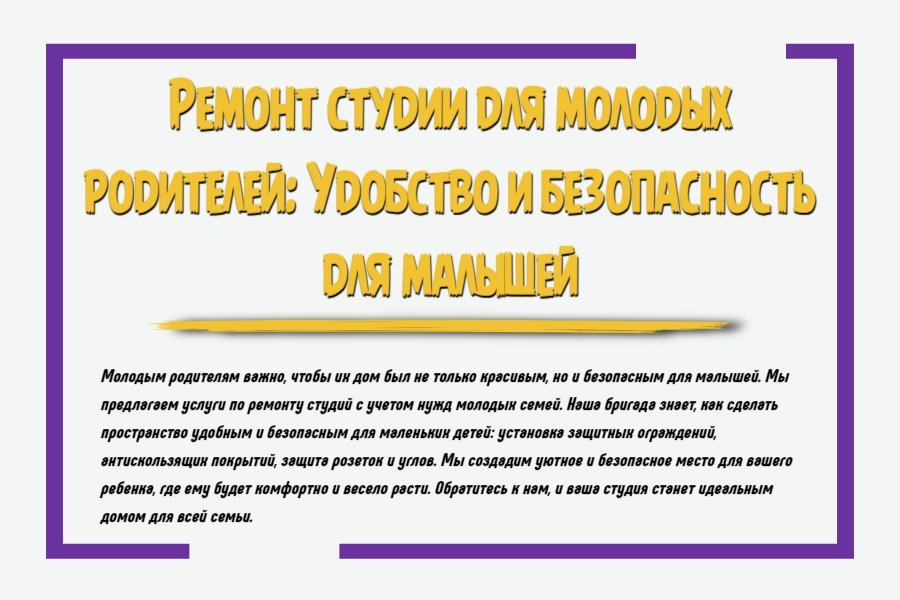 Ремонт студии для молодых родителей требует особого подхода, чтобы создать уютное, функциональное и, самое главное, безопасное пространство для семьи с маленьким ребёнком. Важно учитывать не только потребности взрослых, но и создавать условия, которые обеспечат комфорт и безопасность малышу. Грамотная планировка, выбор безопасных материалов и продуманная организация пространства помогут сделать студию идеальным местом для жизни с ребёнком. Рассмотрим основные аспекты ремонта студии для молодых родителей.